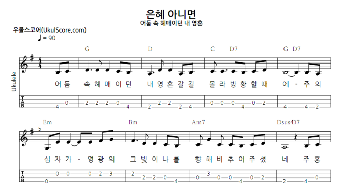 은혜 아니면 (어둠 속 헤매이던 내 영혼) Low-G 튜닝 우쿨렐레 멜로디 악보입니다.