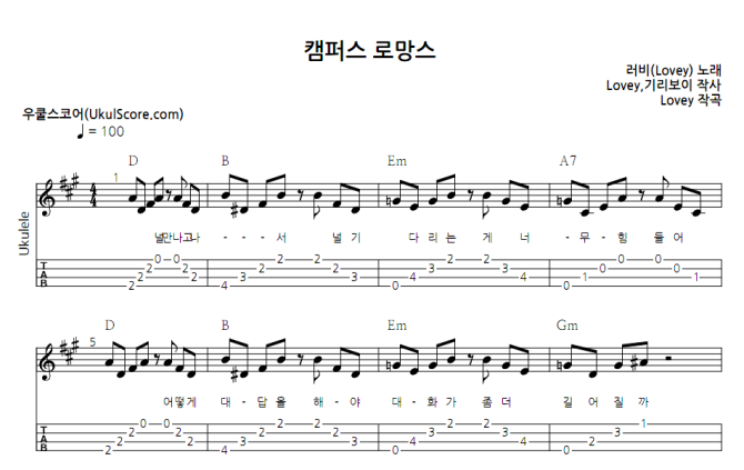 러비의 캠퍼스 로망스를 우쿨렐레 연주곡 악보로 만들어 보았습니다! 가볍게 즐겨주세요! |