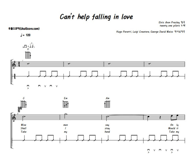 분류: 반주보 추천대상: 팝송 입문용으로 적절합니다. -특이사항- 유튜브 닉네임 [laundry summer_] 님의 요청으로 제작된 악보입니다. 엘비스 프레슬리의 원곡을 21파일럿츠가 커버한 버전입니다. 쉬운 코드와 어렵지 않은 곡 구성, 반복되는 멜로디로 익히기도 부르기도 쉬운 곡이지만 감성을 자극하는 멜로디와 그에 맞는 가사로 엘비스의 명곡을 뽑을 때 빼 놓을 수 없는 곡입니다. twenty one pilots의 젊은 감각으로 살짝 리터치한 곡이지만 원곡과 크게 다르지 않습니다. 연주시 다음의 주의사항을 지켜주시면 완성도가 훨씬 높아집니다. 1. Em코드를 Em7으로 대체하기보다는 Em 그대로 잡아주는 편이 좋습니다. 2. G코드도 마찬가지입니다. G7말고 G로 잡아주세요. 3. B코드는 B7으로 대체하셔도 상관 없습니다만, Low G를 쓰신다면 B코드가 낫습니다. |