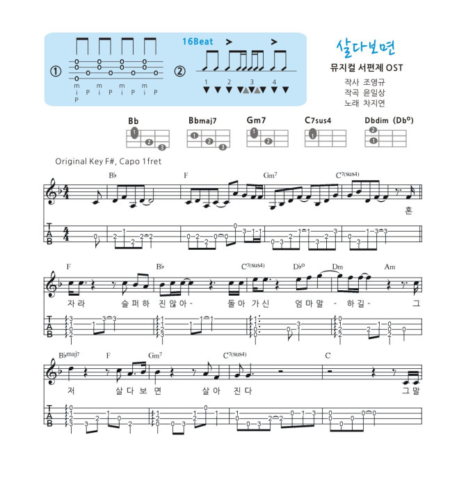 가요 교재 악보 489번 반주 악보입니다 전주 간주 반주 타브, 코드표, 리듬표가 첨부된 교재용 연습용 악보입니다 멜로디 악보를 보시려면 여기를 클릭하세요 http://www.ukulscore.com/bbs/board.php?bo_table=score&wr_id=5855 원곡은 F#키, 악보는 F키 입니다 음원과 함께 연습하시려면 카포를 1플렛에 꼽으시거나 어플을 이용해 음원을 반음 내리시면 됩니다 뮤지컬 서편제 OST 입니다 |