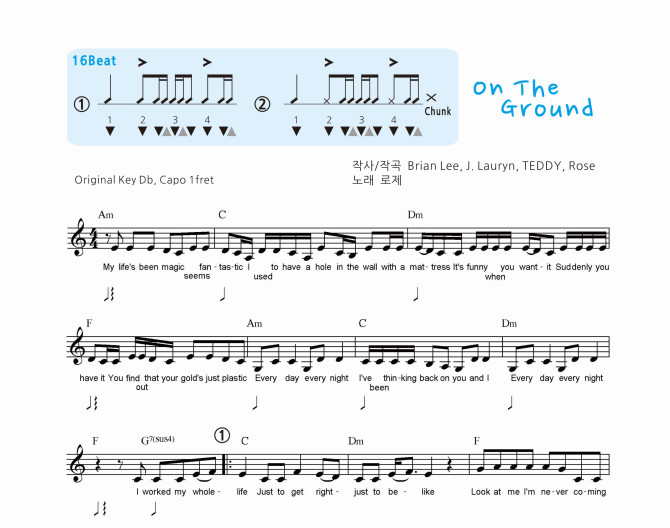 가요 교재 악보 513번 반주 악보입니다 반주 리듬표, 코드표, 타브 반주가 포함된 교재용 연습용악보입니다 멜로디 악보를 보시려면 여기를 클릭하세요 On The Ground (가요교재 514) 멜로디 > 악보 | 우쿨스코어 (ukulscore.com) 원곡은 Db, 악보는 C키 입니다 음원과 함께 연습하시려면 카포를 1플렛에 꼽으시거나 어플을 이용해 음원을 반음 내리시면 됩니다 |