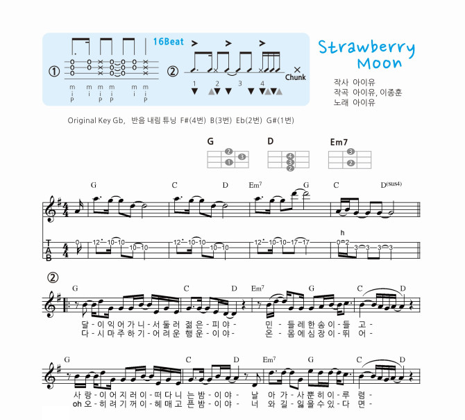 가요 교재 악보 564번 반주 악보입니다 전주 간주 타브, 코드표, 리듬표가 첨부된 교재용 연습용 악보입니다 멜로디 악보를 보시려면 여기를 클릭하세요 Strawberry Moon (가요교재 565) 멜로디 > 악보 | 우쿨스코어 (ukulscore.com) 원키는 Gb, 악보는 G키입니다 또는 어플을 이용해 음원을 반음 내려 연습하실 수 있습니다. |