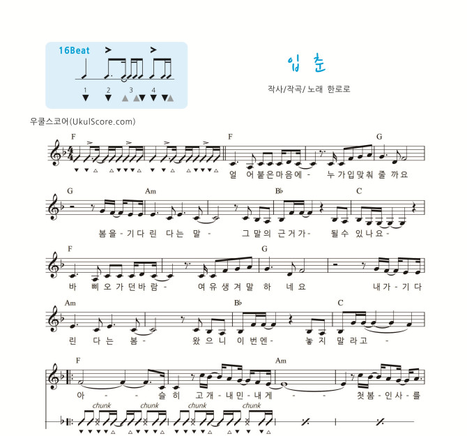 가요 교재 악보 947번 반주 악보입니다 전주 간주 타브, 코드표, 리듬표가 첨부된 교재용 연습용 악보입니다 멜로디 악보를 보시려면 여기를 클릭하세요 입춘 (가요교재 948) 멜로디 > 악보 | 우쿨스코어 |