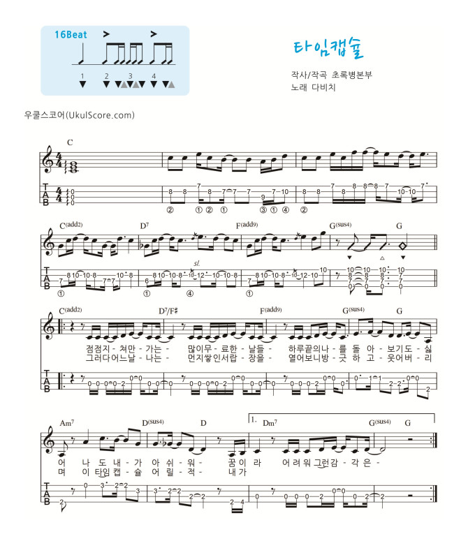 가요 교재 악보 952번 멜로디 악보입니다 전주 간주 멜로디 타브, 코드표, 리듬표가 첨부된 교재용 연습용 악보입니다 반주 악보를 보시려면 여기를 클릭하세요 타임캡슐 (가요교재 951) 반주 > 악보 | 우쿨스코어 | ||