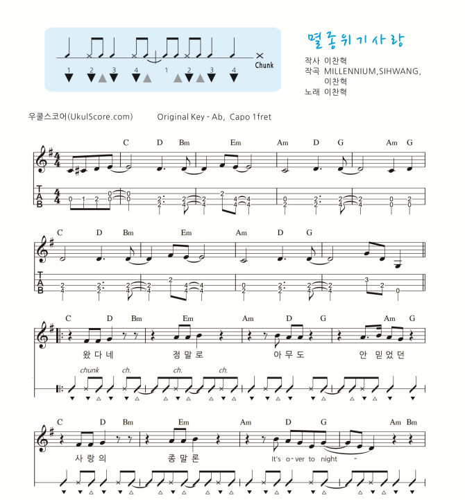 가요교재 악보 959번 반주 악보입니다 전주 간주 반주 타브, 코드표, 리듬표가 첨부된 교재용 연습용 악보입니다 멜로디 악보를 보시려면 여기를 클릭하세요 멸종위기사랑 (가요교재 960) 멜로디 > 악보 | 우쿨스코어 원곡은 Ab, 악보는 G키 입니다 원곡 음원에 맞추어 연습하시려면 카포를 1플렛에 꼽으시거나 어플을 이용해 음원을 반음 내리시면 됩니다 교재 문의 및 레슨문의 010-2247-1010 (수원 싱글벙글 우쿨렐레) | ||