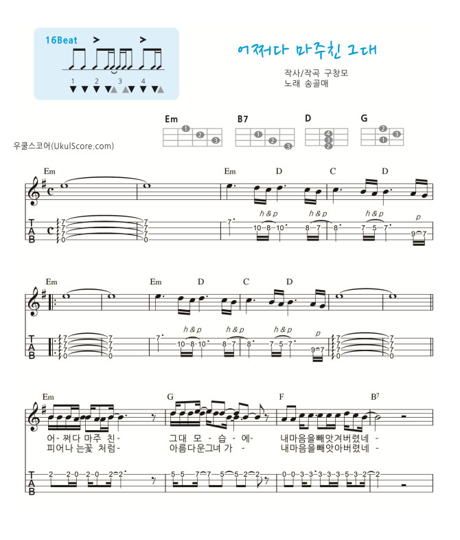 가요 교재 악보 962번 멜로디 악보입니다 전주 간주 멜로디 타브, 코드표, 리듬표가 첨부된 교재용 연습용 악보입니다 쉬운 반주 악보를 보시려면 여기를 클릭하세요 어쩌다 마주친 그대 (가요교재 82) > 악보 | 우쿨스코어 하이코드 반주 악보를 보시려면 여기를 클릭하세요 어쩌다 마주친 그대 (가요교재 961) 하이코드 반주 > 악보 | 우쿨스코어 교재 문의 및 레슨문의 010-2247-1010 (수원 싱글벙글 우쿨렐레) https://blog.naver.com/scribe2005/223262656142 | ||