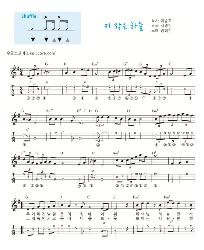 가요 교재 악보 967번 멜로디 악보입니다 전주 간주 멜로디 타브, 코드표, 리듬표가 첨부된 교재용 연습용 악보입니다 2장으로 편집된 반주 악보를 보시려면 여기를 클릭하세요 키 작은 하늘 (가요교재 966) 반주 > 악보 | 우쿨스코어 교재 문의 및 레슨문의 010-2247-1010 (수원 싱글벙글 우쿨렐레) | ||