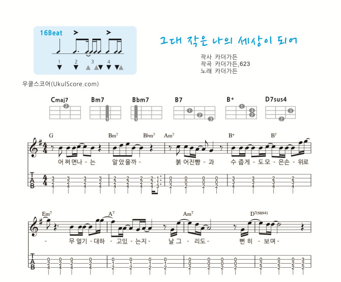 가요 교재 악보 968번 반주 악보입니다 반주 간주 타브, 코드표, 리듬표가 첨부된 교재용 연습용 악보입니다 멜로디 악보를 보시려면 여기를 클릭하세요 그대 작은 나의 세상이 되어 (가요교재 969) 멜로디 > 악보 | 우쿨스코어 교재 문의 및 레슨문의 010-2247-1010 (수원 싱글벙글 우쿨렐레) | ||